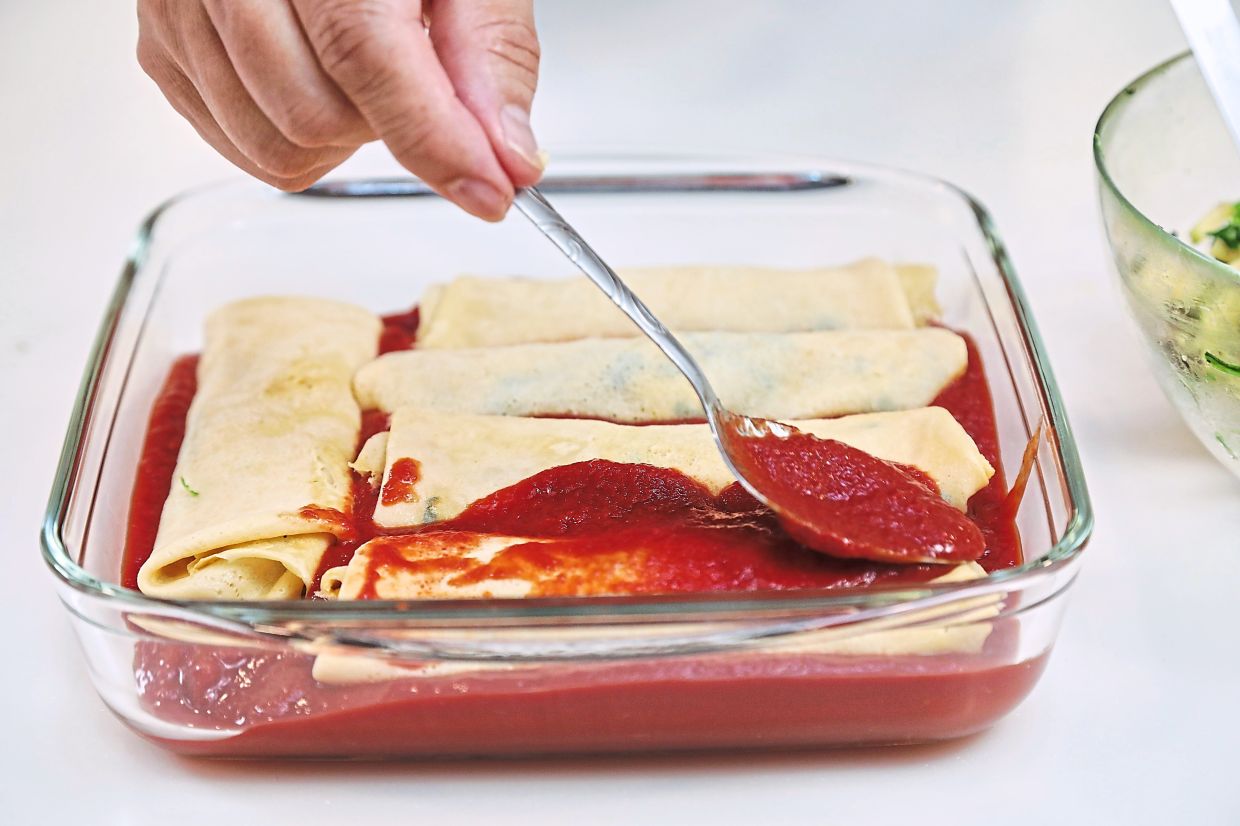 Spread two tablespoons of filling into the centre of a crepe, fold up the sides and roll the manicotti into a log.